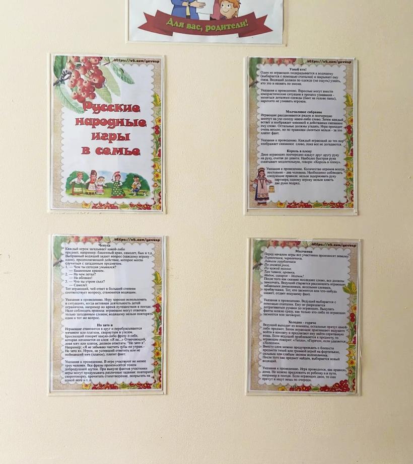 В детском саду воспитатели продолжают знакомить детей с понятием «Год единства народов России»: совместно с детьми оформляются альбомы, проводятся беседы по теме «Мои корни», пополнены патриотические уголки материалом о многонациональности нашего государства, дети посмотрели мультфильмы, рассказывающие о нашей республике, городе, играли в подвижные игры разных народов, в родительских уголках разместили материал для ознакомления родителей.